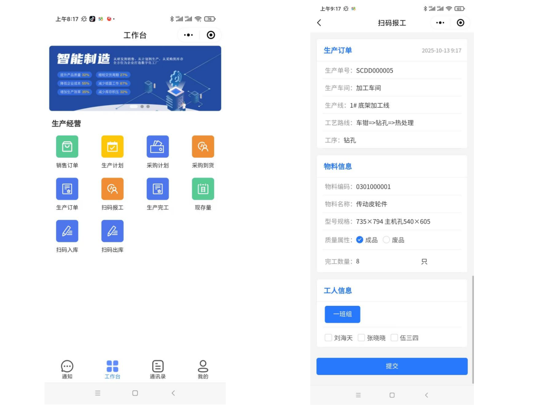 同时,手机端可以通过APP进行扫码工序报工。