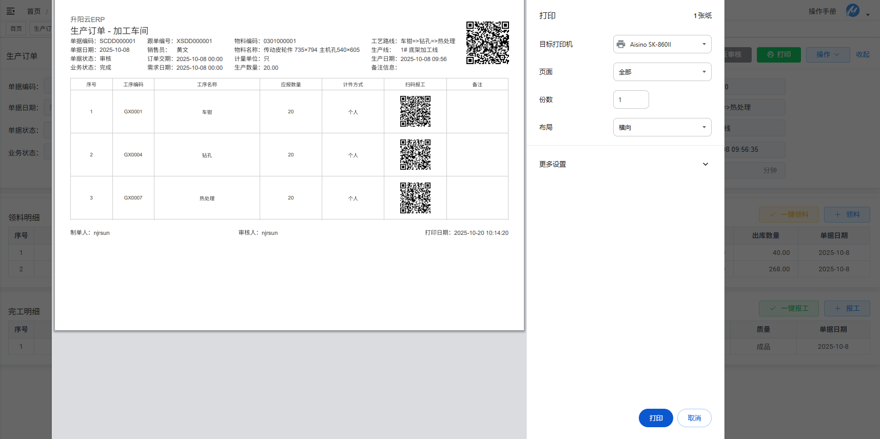 打印生产订单如上,发放到生产工位,完工生产后根据工序用微信小程序扫码进行报工。